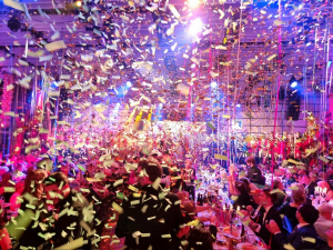 Unsere Auftrittsgruppe gratulierte dem frischgekürten Prinzenpaar mit einem Überraschungsauftritt im Showprogramm. Und zur Feier dieses sehr besonderen Tages ließen wir im Publikum einen wahren Konfettiregen auf das Publikum niedergehen.