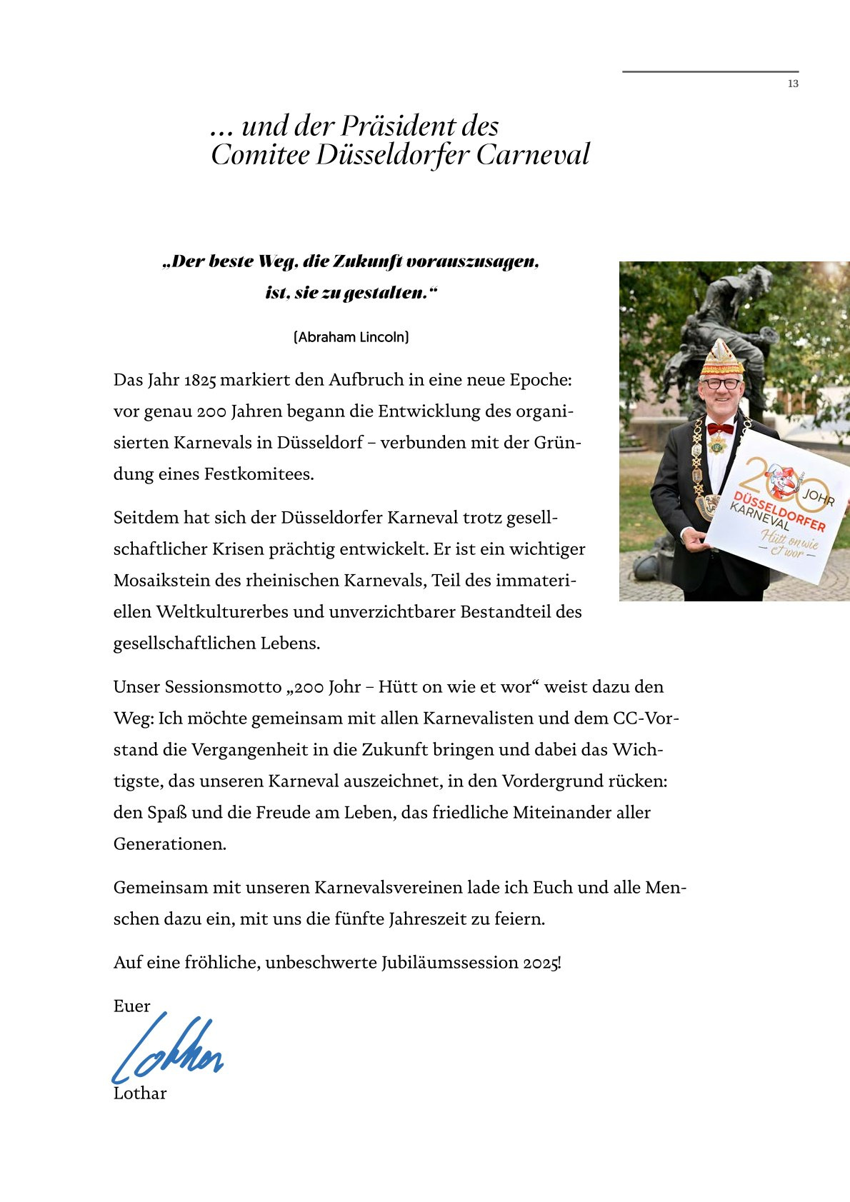 - Grußworte von NRW-Ministerpräsident Hendrik Wüst, Düsseldorfs Oberbürgermeister Dr. Stephan Keller, unseres Vorsitzenden Norman Sandrock und Lothar Hörning (in Doppelfunktion als Ehrenpräsident und CC-Präsident!),
